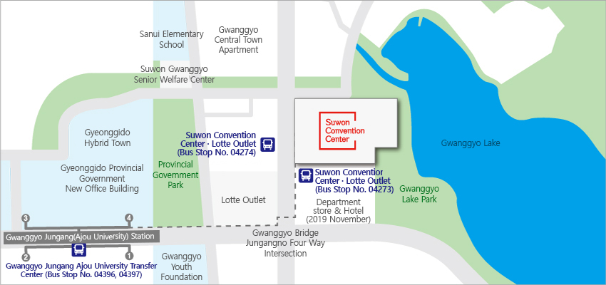 Take Bus No. 8877(60~80 Mins) → Get off at ‘Suwon Convention Center ’ → Walk to Suwon Convention Center (Approx. 3 Mins on foot)